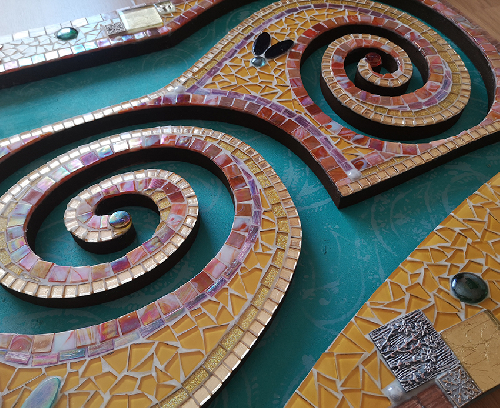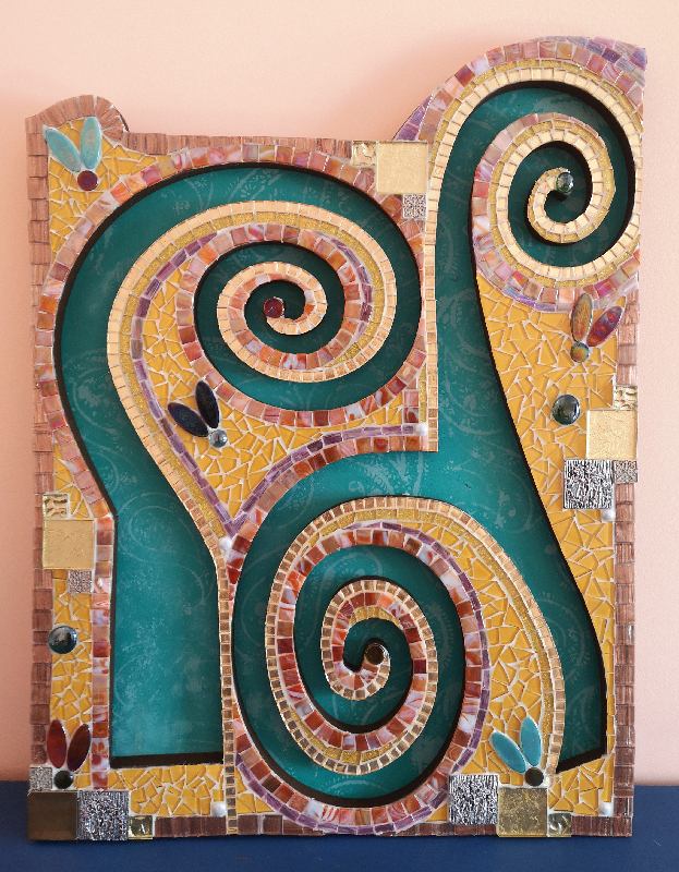 Klimt hangulatát és színeit idéző arany, irizáló és gyöngyházfényű , valamint fém dekor és kristáymozaikkal díszített faágak, átlátszó epoxy fugával kitöltve.