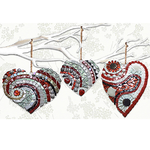 Három különböző formájú, egyenként kb.16x20 cm nagyságú, fehér és piros irizáló, gyöngyházfényű, csillogó mozaikokból kirakva.