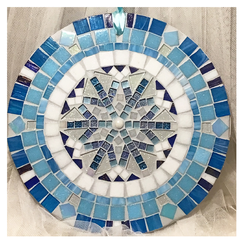 Kék, fehér standard, kristály és csillogó, irizáló mozaikszemekkel díszített adventi ajtókopogtató függődísz.